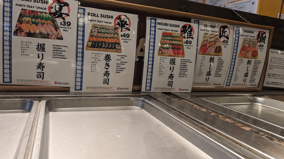 The menu at Seiwa Market features a range of Japanese grocery products alongside prepared food options. Visitors can find both hot and cold items, including sushi and sashimi, which are available for takeout and casual dining at on-site seating. The food selection also includes items such as poke bowls, tamagoyaki (Japanese sweet eggs), grilled eel, and chirashi (sashimi rice bowls). Fresh produce and other grocery staples are part of the overall offering, supporting a variety of meal preparations at home.